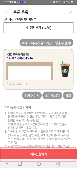 (오른쪽 사진) 쿠폰이 잘 올라갔고 추가 이미지나 추가 메세지가 없다면 리뷰 신청하기를 눌러줍니다.