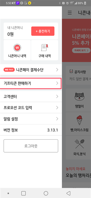 (오른쪽 사진) 기프티콘 판매를 하기 위해 접속 했으니 기프티콘 판매를 눌러줍니다.