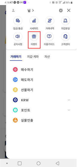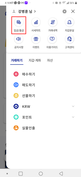 (가운데 사진) 왼쪽 위의 입금/출금을 눌러줍니다.