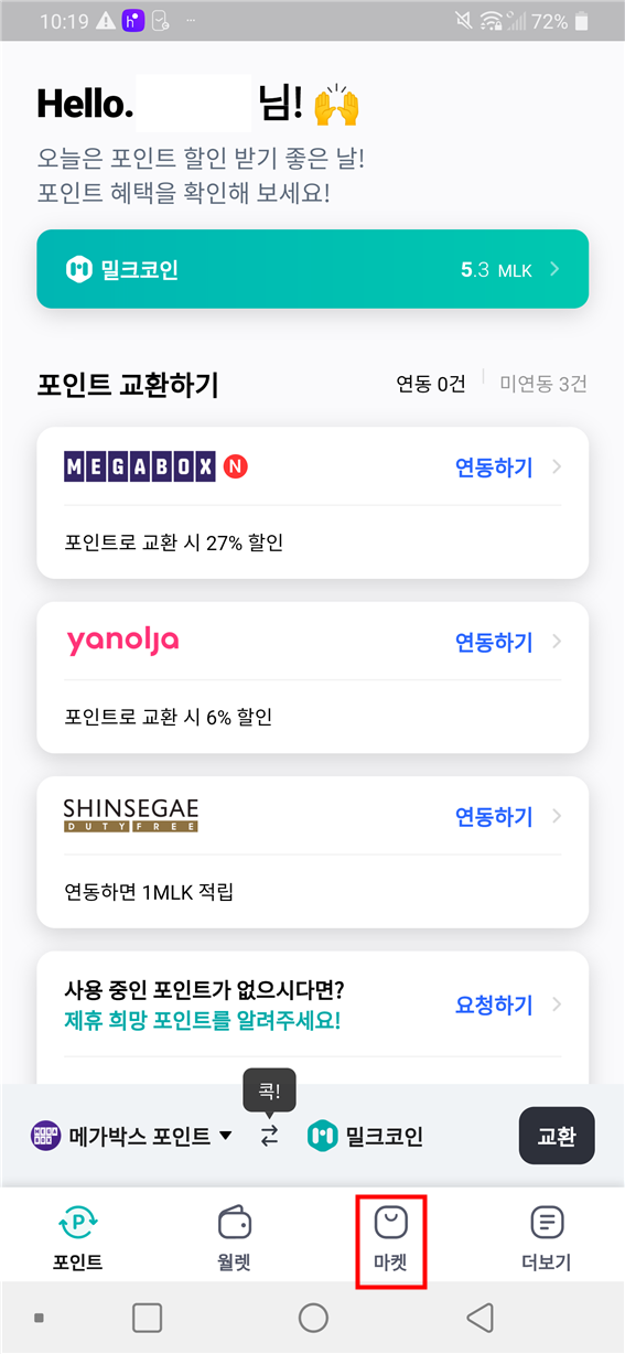 (왼쪽 사진) 앱을 실행하면 나오는 화면에서 상단의 밀크코인을 눌러줍니다.