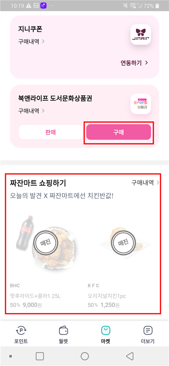 짜잔마트 상단에 있는 문화상품권 구매버튼을 눌러줍니다.