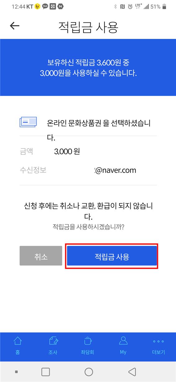(가운데 사진) 선택에 대해 정리해서 보여주는군요. 적립금 사용을 눌러줍니다.