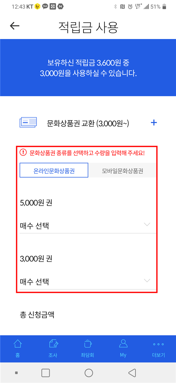 (오른쪽 사진) 원하는 문화상품권의 정류와 매수를 정합니다.