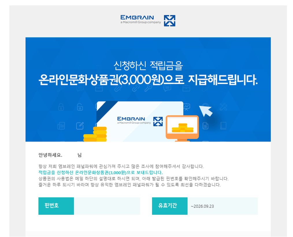 자신의 이메일을 확인해보시면 신청한 문화상품권이 도착한 것을 알 수 있습니다.