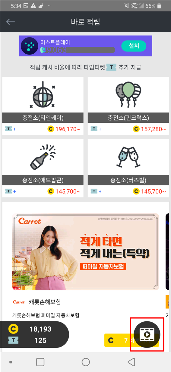 (왼쪽 사진) 만약 티켓이 없다면 메인화면의 바로 적립을 눌러줍니다.