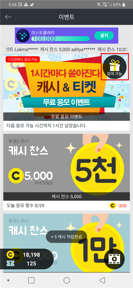 (오른쪽 사진) 상자를 터치해주면 캐시를 얻을 수 있습니다.