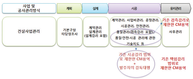 「건설산업기본법」 제2조제8호 : "건설사업관리"란 건설공사에 관한 기획, 타당성 조사, 분석, 설계, 조달, 계약, 시공관리, 감리, 평가 또는 사후관리 등에 관한 관리를 수행하는 것을 말한다.