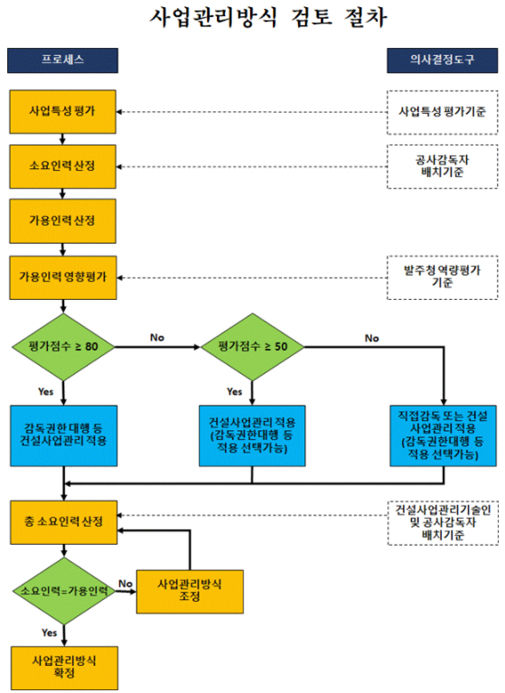 「건설공사 사업관리방식 검토기준 및 업무수행지침」 제5조제3항 : 발주청은 건설사업관리 등 사업관리방식 검토 시 다음 각 호의 사항을 검토하여야 하며 검토 절차는 별표 1과 같다.