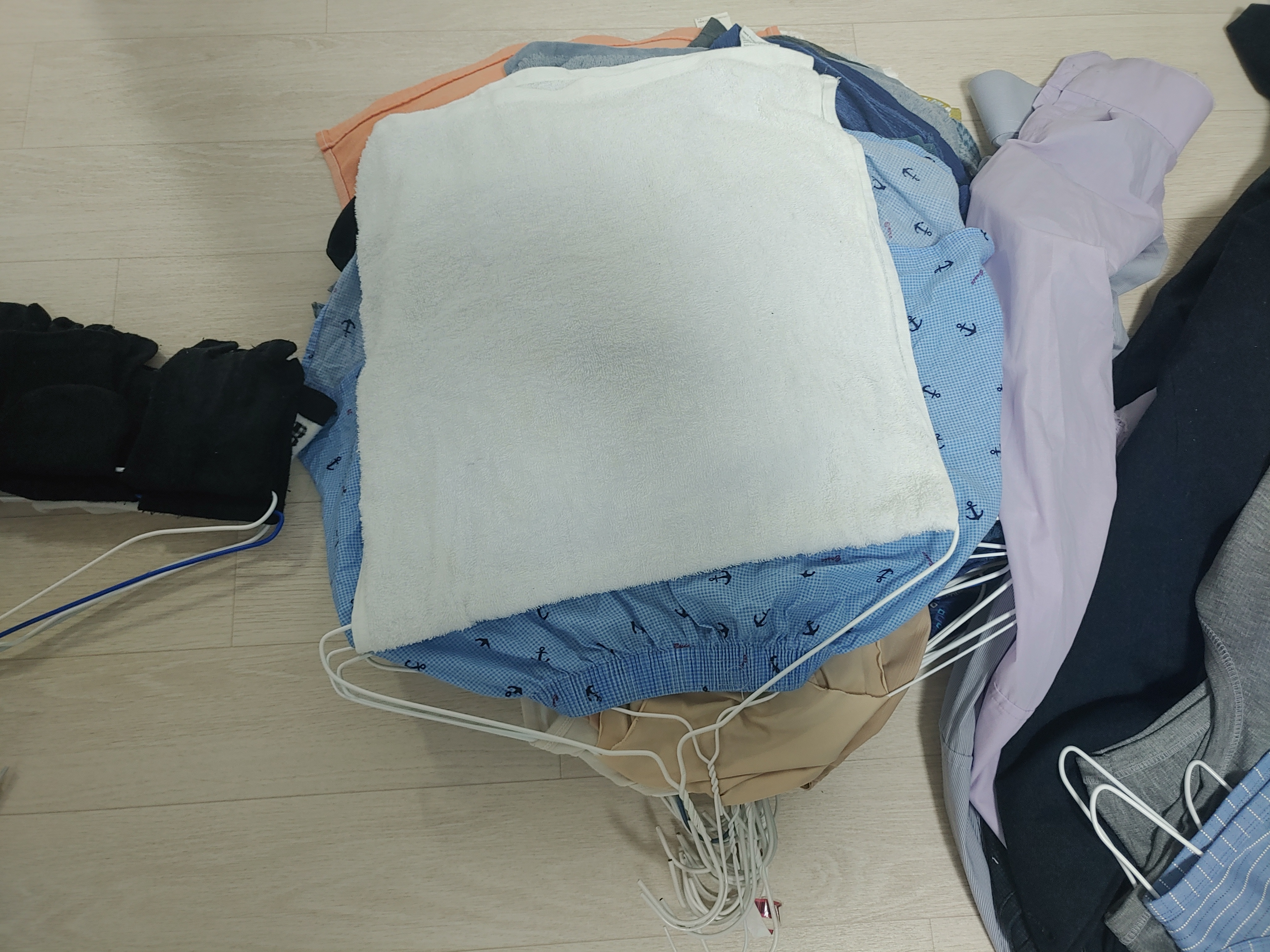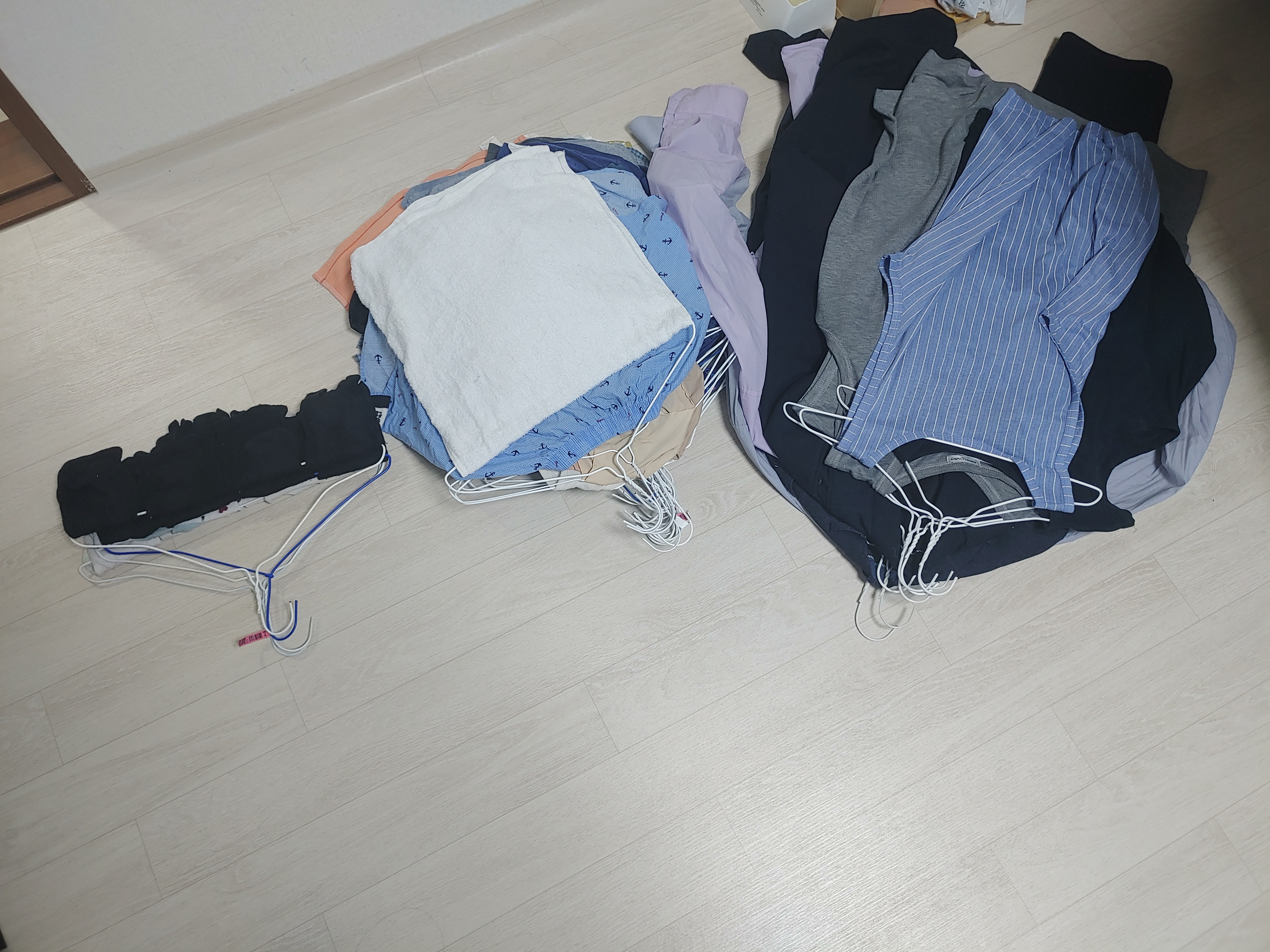 옷걸이 걸은 세탁물들을 1곳에 쌓지 않고 3곳에 나눠서 쌓은 이유는 무엇일까요?