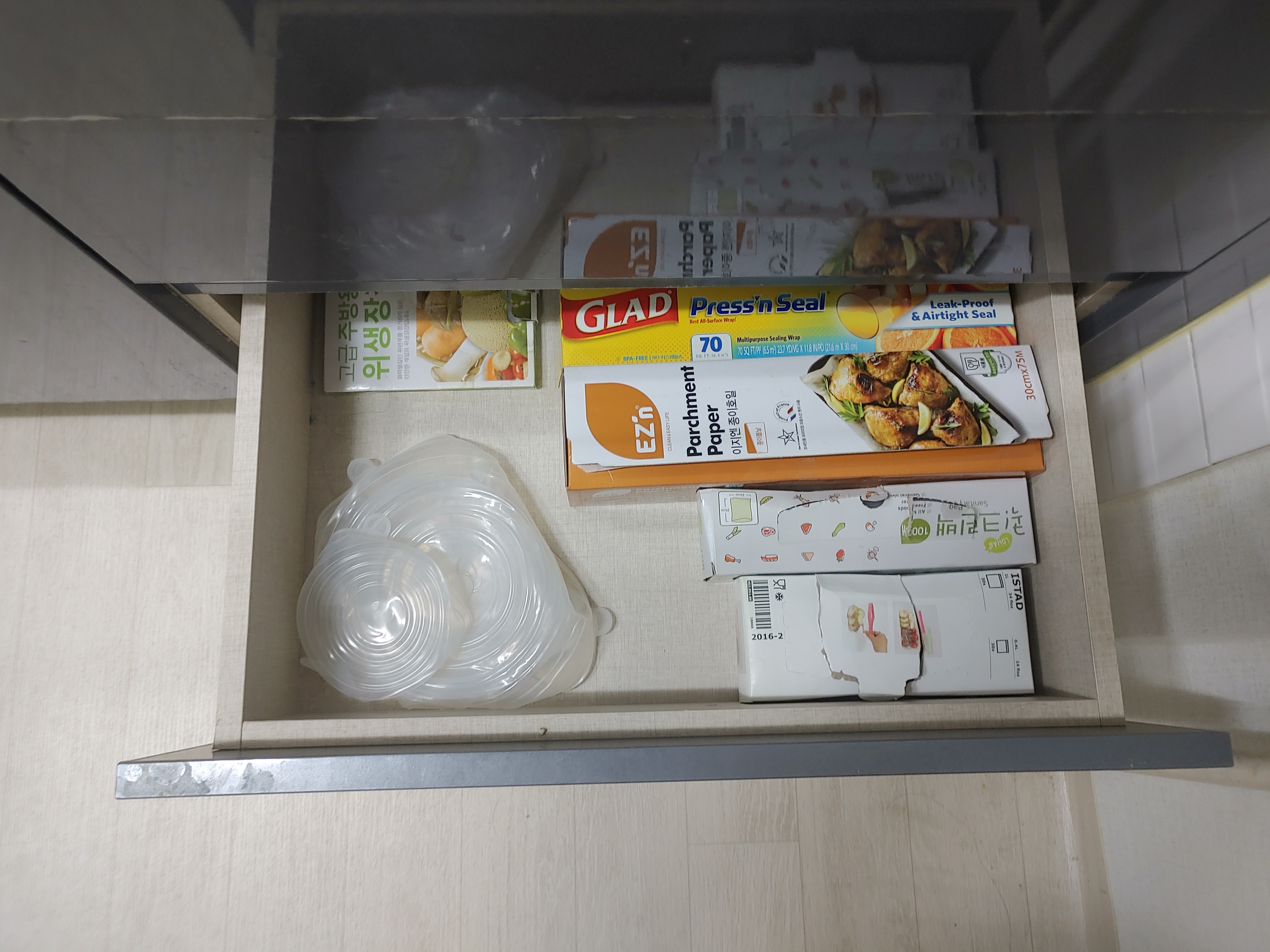 가스레인지 아래쪽의 서랍들의 모습입니다.