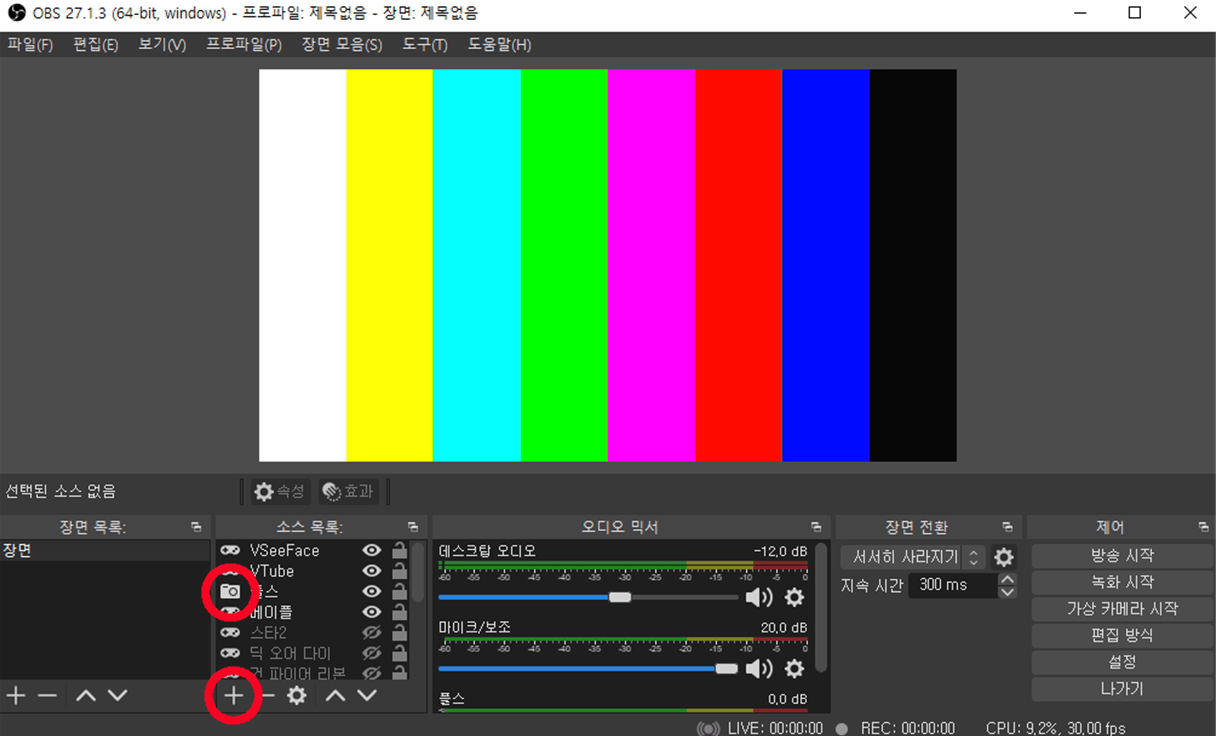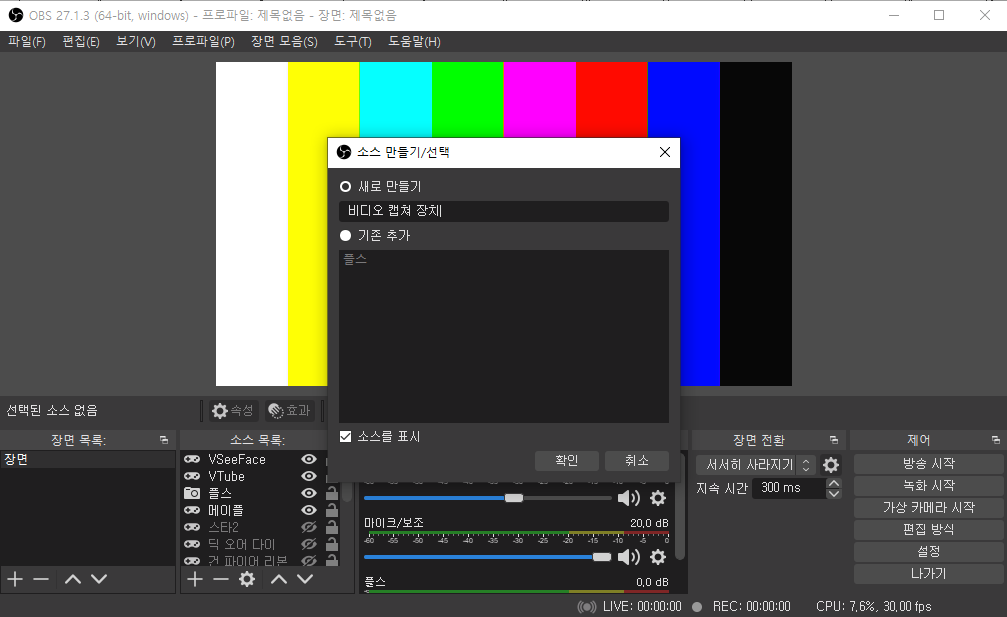 아래쪽 의 + 버튼을 눌러서 사진기 모양의 '비디오 캡쳐 장치'를 선택합니다.