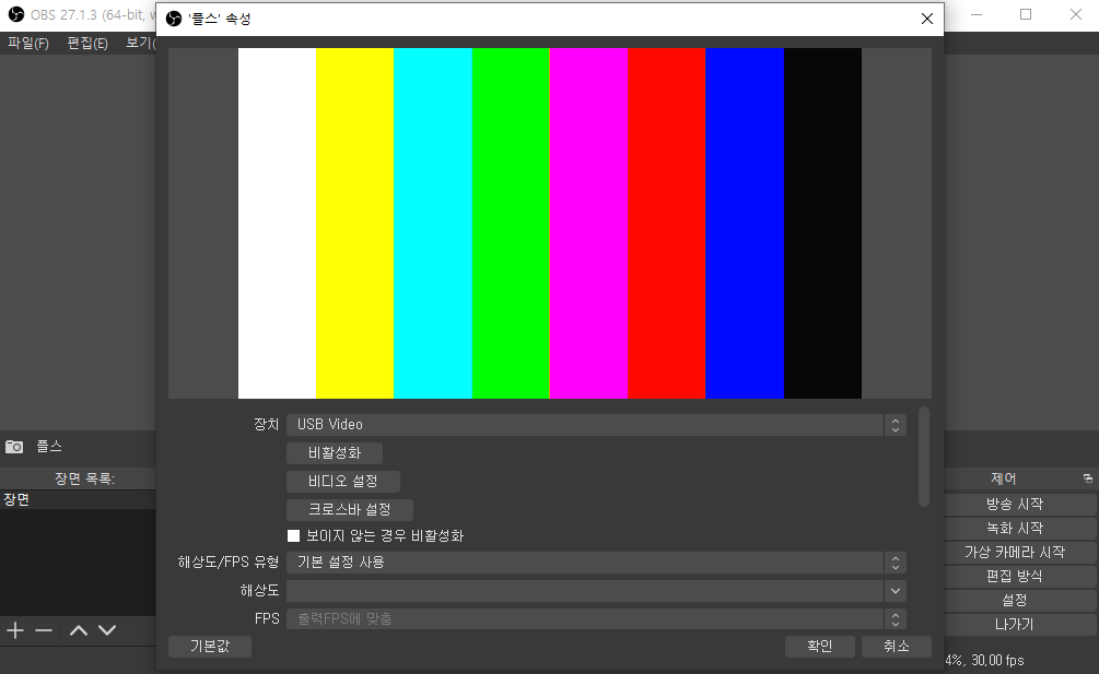 장치에 USB Video를 선택해주면 셋팅은 끝납니다.