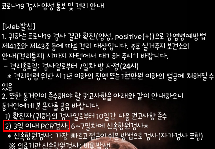 검사 결과에는 코로나 양성과 동거인의 PCR 검사 권고가 포함되어 있었다.