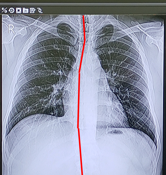 자료가 남아 있는 코로나 때문에 찍었던 X-ray 사진의 척추 중심선을 그어보면 그 심각성을 알 수 있다.