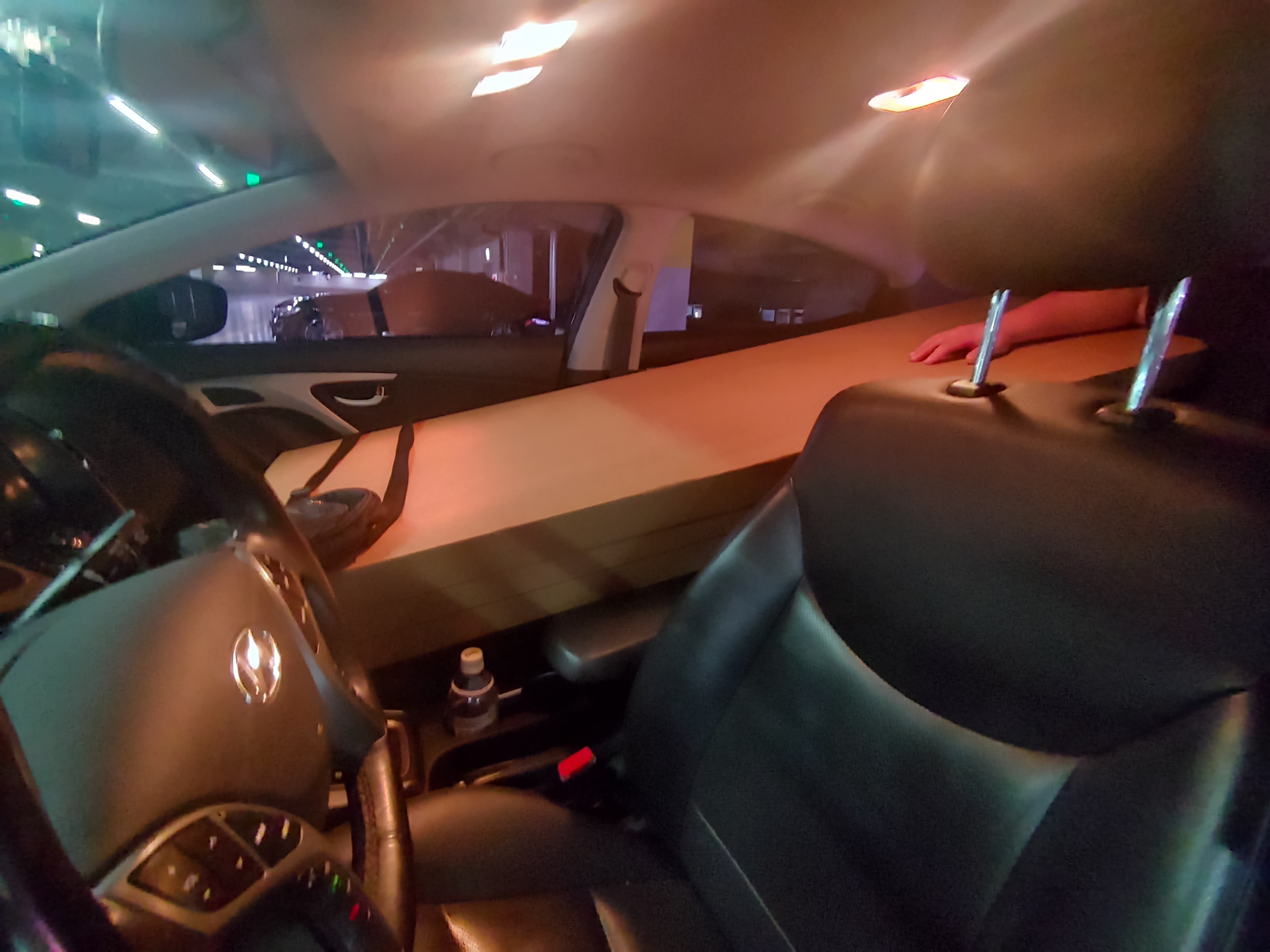 조수석을 최대한 뒤로 꺾은 뒤 머리 받이를 뽑은 후,