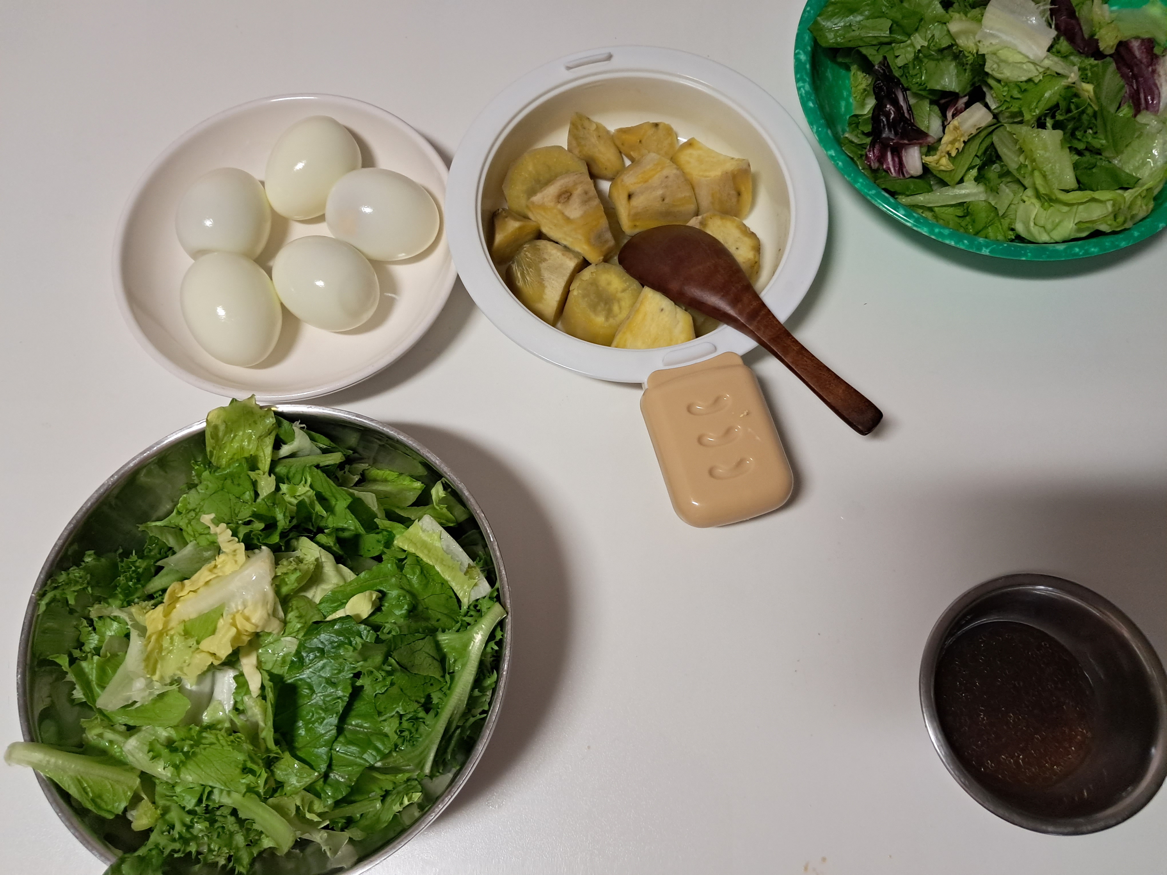 샐러드 150g (184kcal) + 삶은 계란 3개 (240kcal) = 424kcal