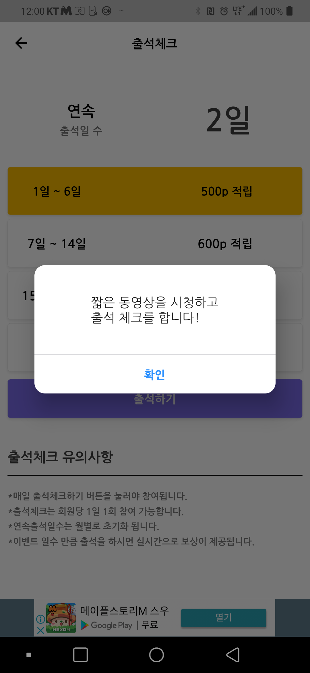 단, 단점이라면 출석체크와 채굴 수령 시 동영상을 봐야합니다.