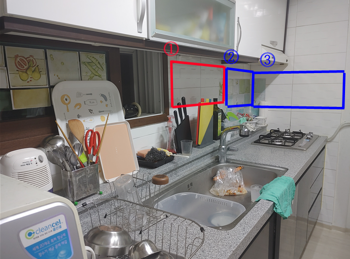주방을 바라봤을 때, 요리를 위해 필요한 공간을 제외하면 대략 3개의 공간을 찾을 수 있습니다.