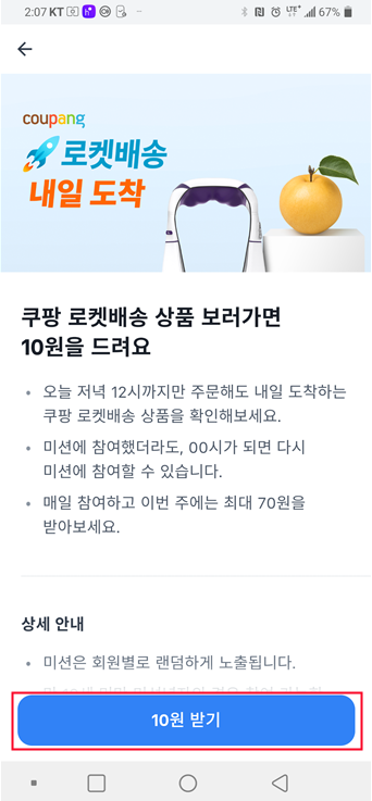 (가운데 사진) 우선 쿠팡을 눌러서 들어간 다음 '10원 받기'를 누르면