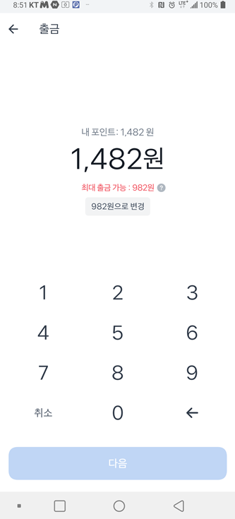 그래서 최대치로 올려봤는데 왠걸 최대출금가능 금액이 982원이라고 뜨네요.