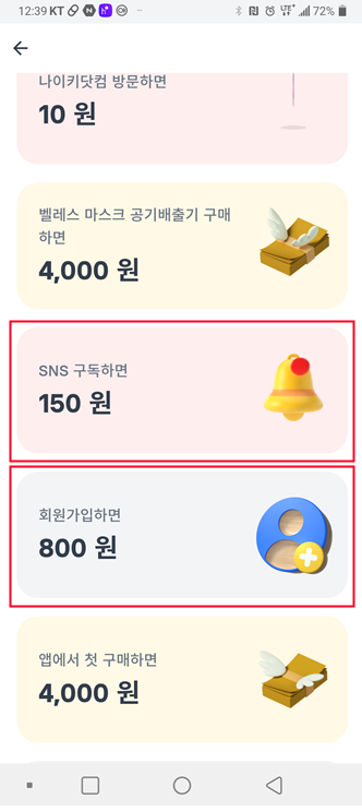 (오른쪽 사진) SNS구독은 리워드가 150원이네요. 간단한 것에 비해 금액이 큰게 아주 좋은 항목입니다.