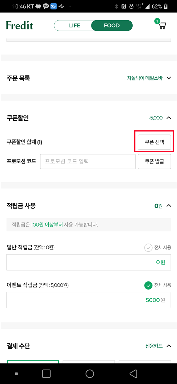 쿠폰은 한 번에 한 개만 사용할 수 있기 때문에 1번까지 못 쓰는게 아쉬웠습니다.