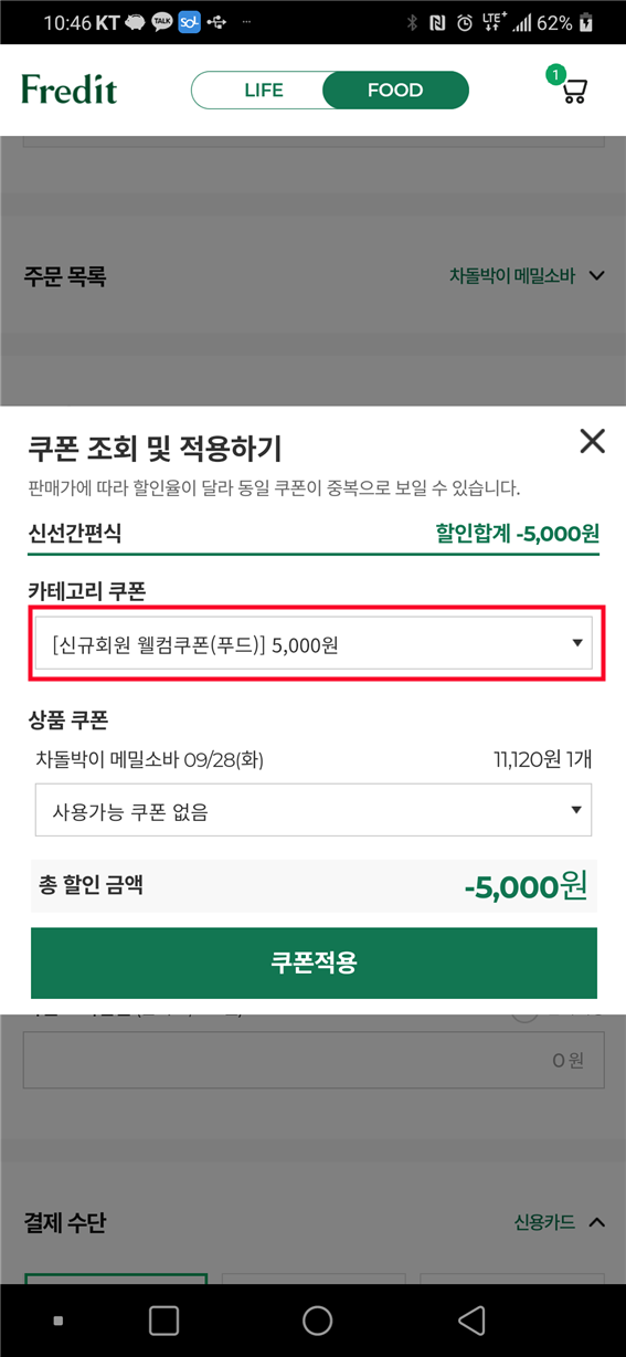 2. 푸드 카테고리 10,000원 이상 구입 시 5,000원 할인 쿠폰