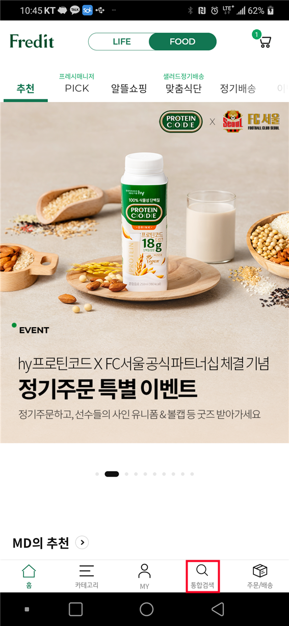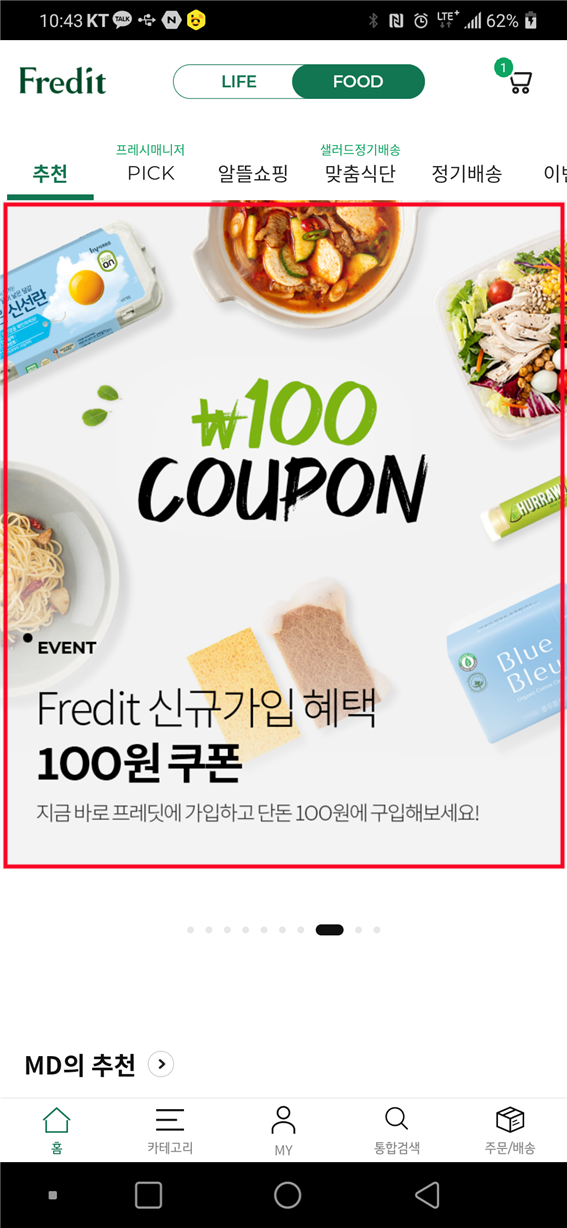 상단 오른쪽의 푸드를 눌러주세요. 그 뒤에 가운데 큼직하게 떠 있는 베너를 넘기다보면