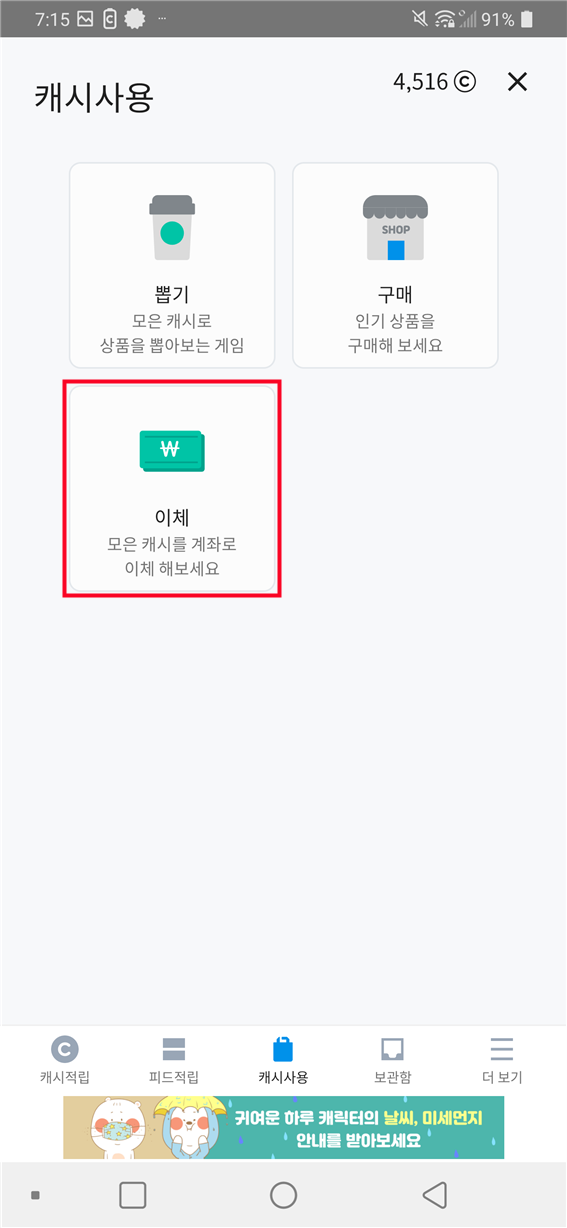 10000캐시 이상 모으실 수 있다면 이체를 하는 것이 이득이고