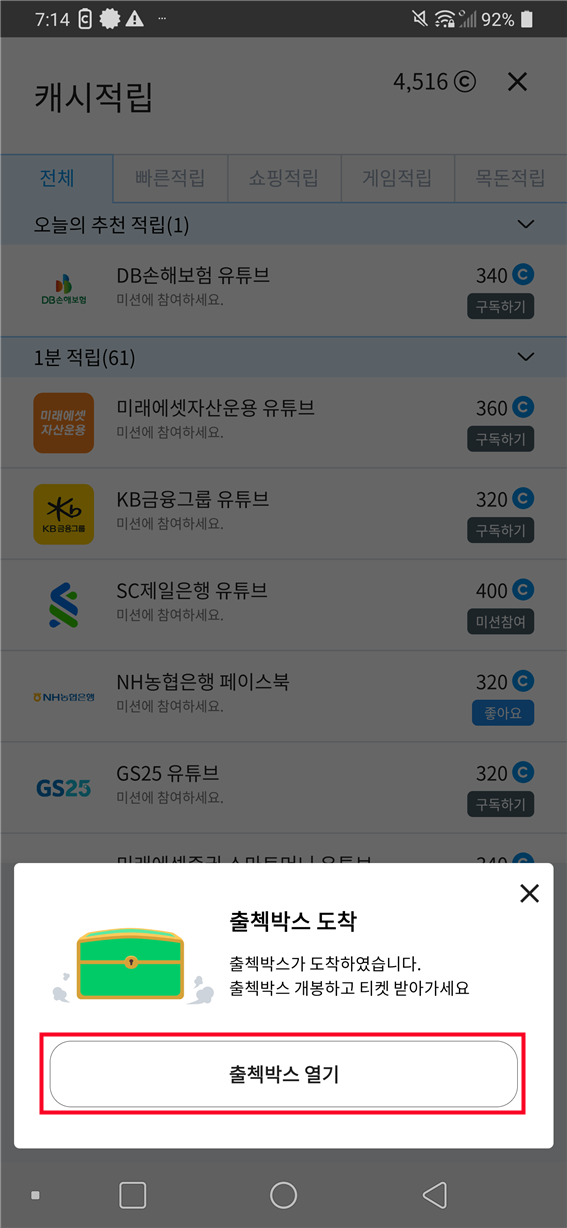 (오른쪽 사진) 하루에 한 번 출첵박스를 얻을 수 있습니다.