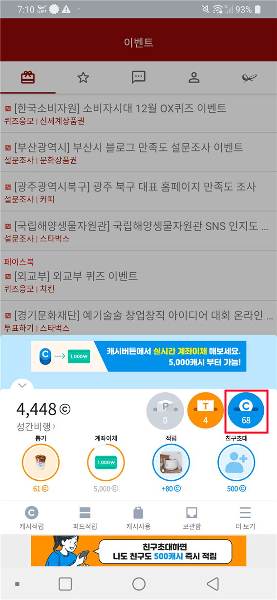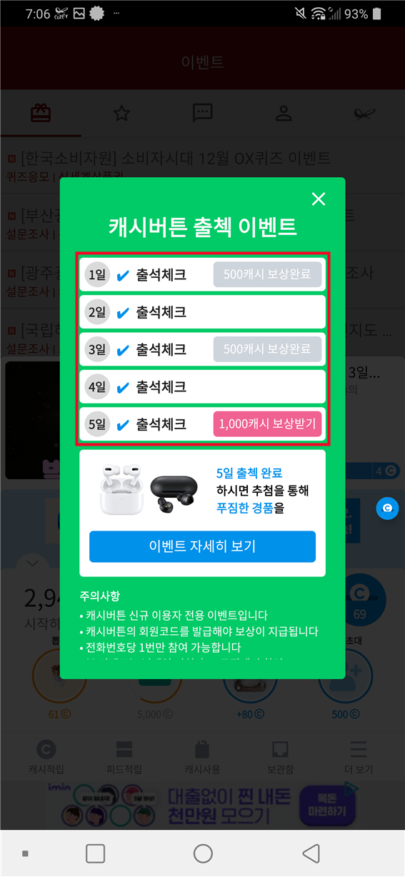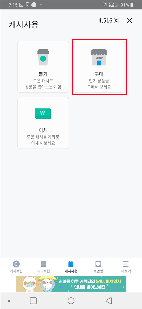 (가운데 사진) 눌러서 들어가면 캐시를 적립할 수 있는 버튼이 나옵니다.