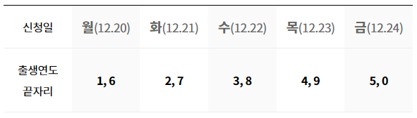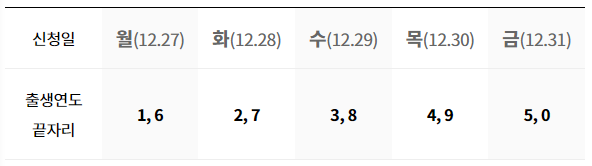 * 12. 20. ~ 12. 24.(5일간)/출생년도 끝자리 요일제 신청