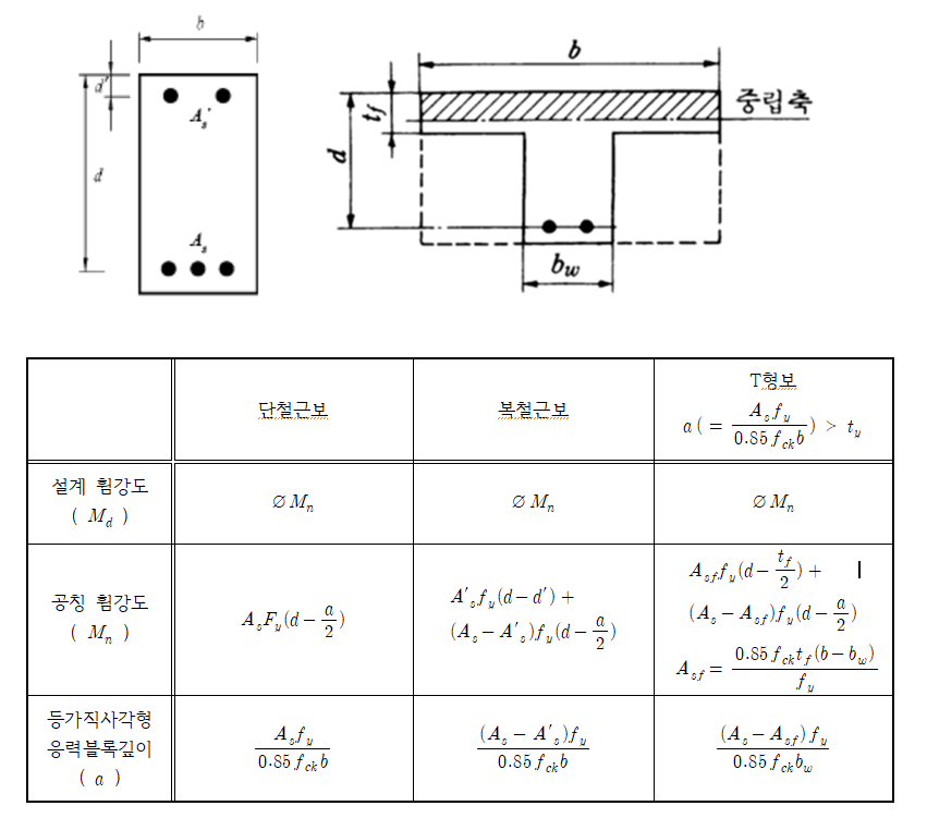 단철근보, 복철근보, T형보의 휨강도와 블록깊이