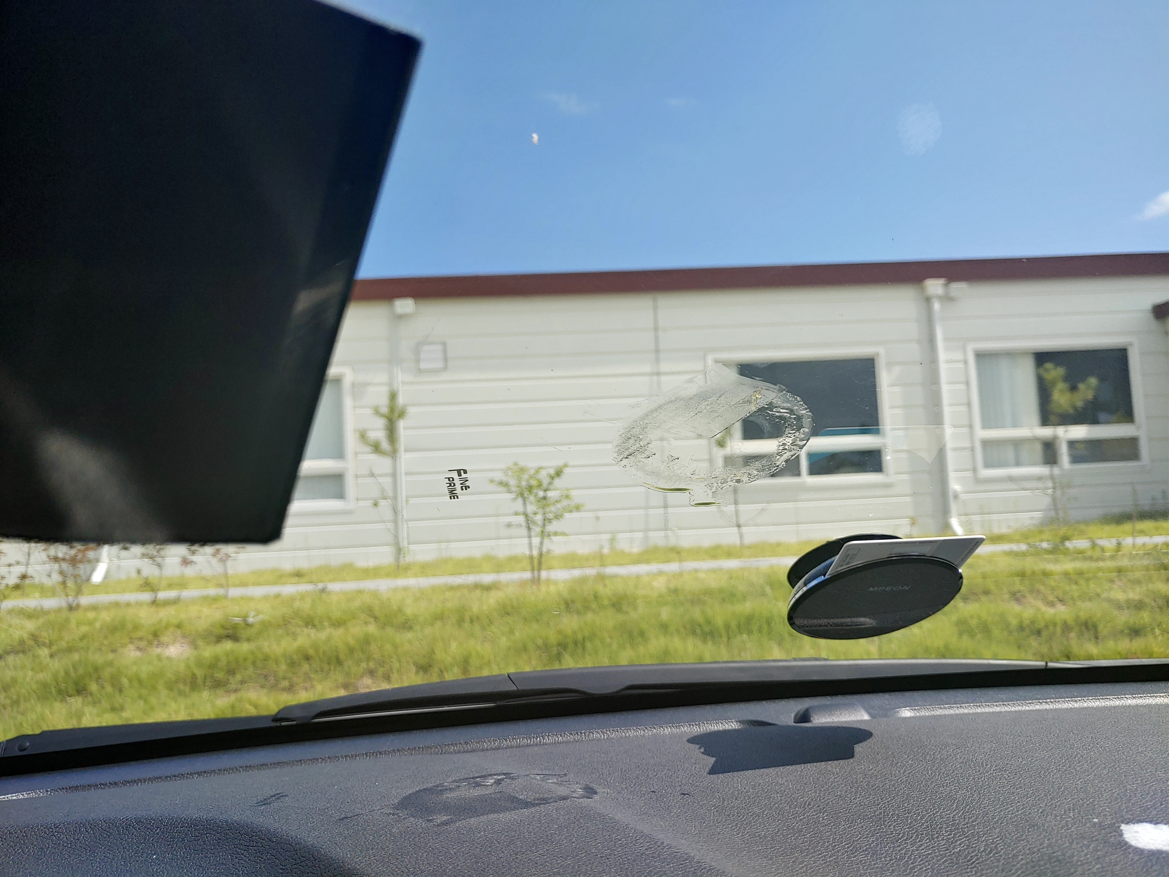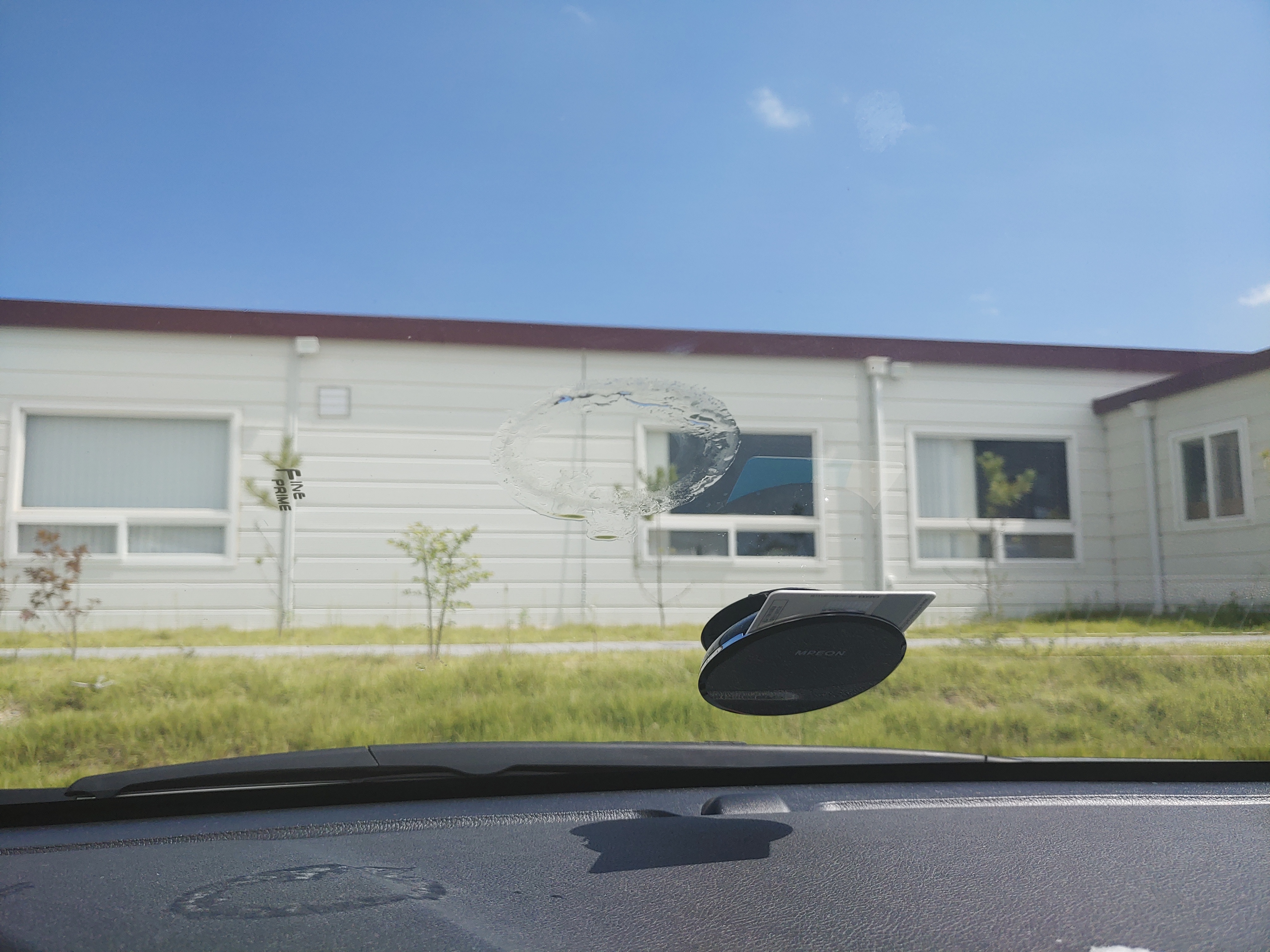 차 앞 유리에 큰 흔적을 남기고 만 것이죠.