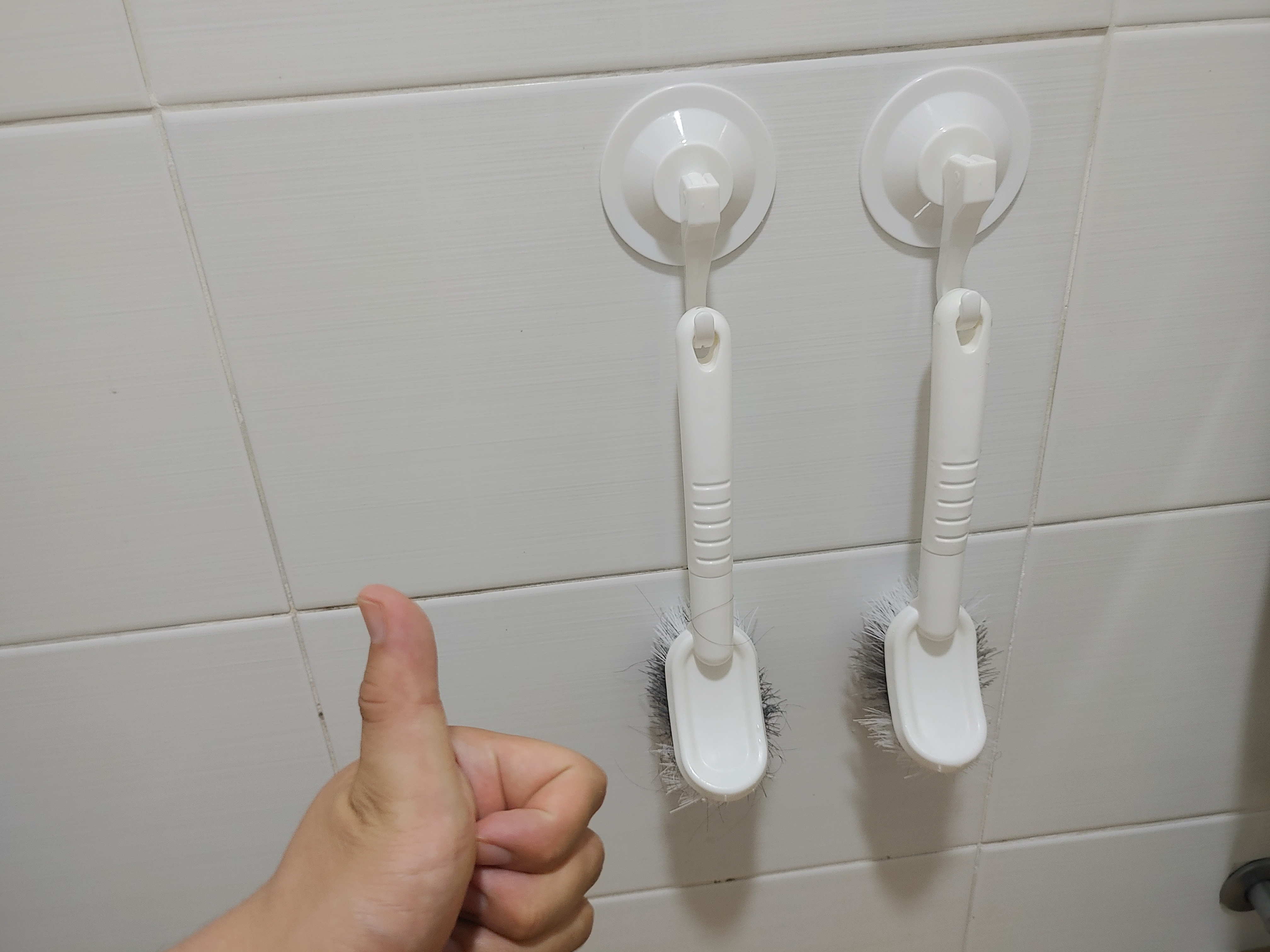 강력흡착후크를 붙일 면을 깨끗이 닦아줍니다. 간단히 설치를 한 뒤 청소 솔을 걸어주면